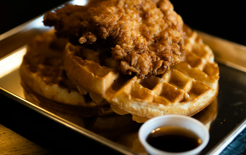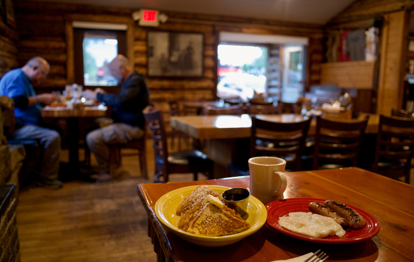 Enjoy American comfort food in a charming, century-old log cabin just off the Town Square, including various dishes garnished with “Pig Candy” (candied bacon).