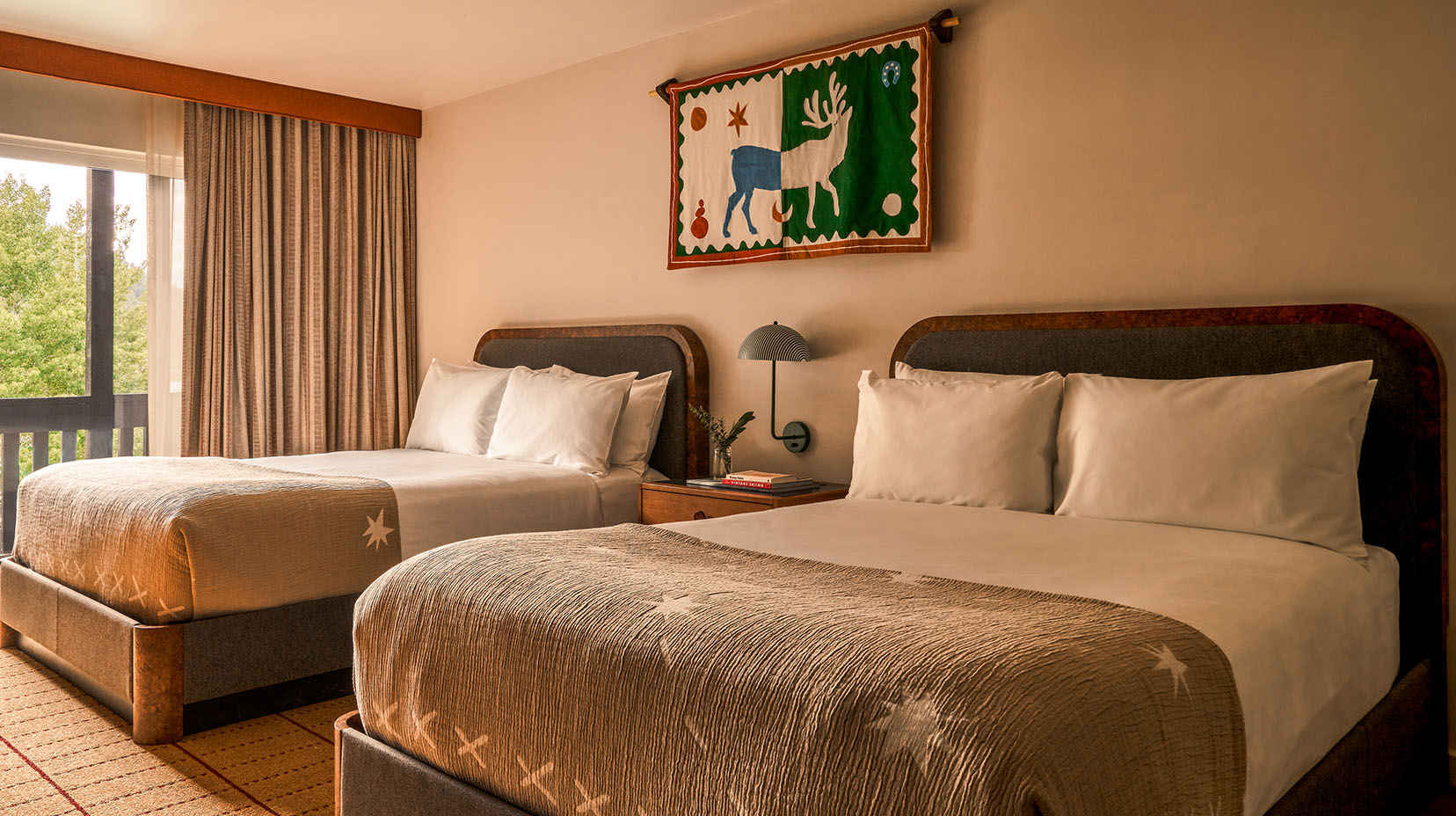 The group can wake up rested in this newly-renovated alpine room with mountain views and two queen beds. Features an en suite, modern bathroom and shower.