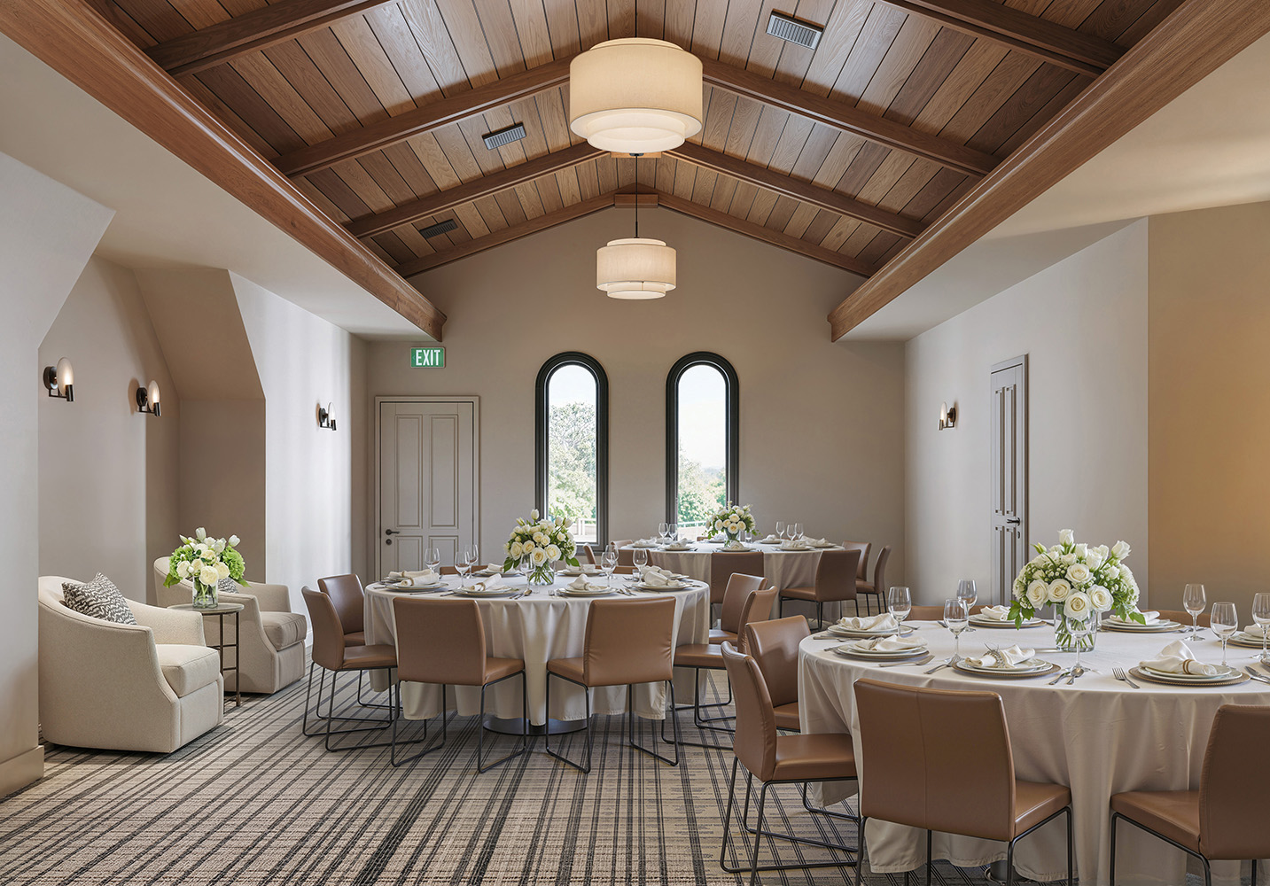 The Landing serves as our property's peaceful haven, with vaulted ceilings and an ethereal atmosphere that breathe calm and creativity into the space. Reserve this intimate space for celebratory welcome dinners and cocktail hours, or plan for a wedding-morning yoga class or sound bath to start your special day off in a meditative state.