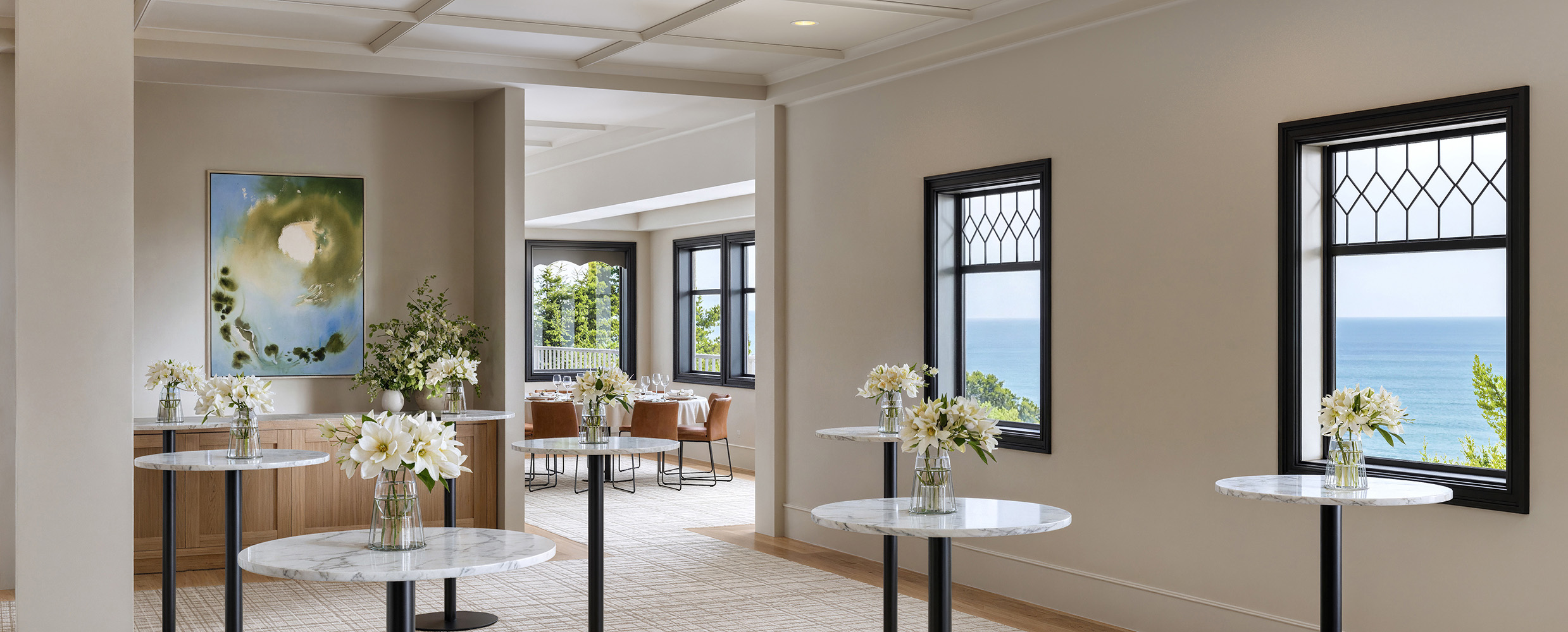 Upstairs, The Terrace unfolds across a welcoming foyer, scenic lookout, and landing that can be used individually or together to shape your event flow. Start with a ceremony or first-look moment overlooking the grounds, then move into a relaxed cocktail hour with passed bites and local sparkling wine. Large windows and elevated views give you a front-row seat to the shifting coastal light, while the flexible footprint can handle everything from an intimate dinner to a full second-story reception.